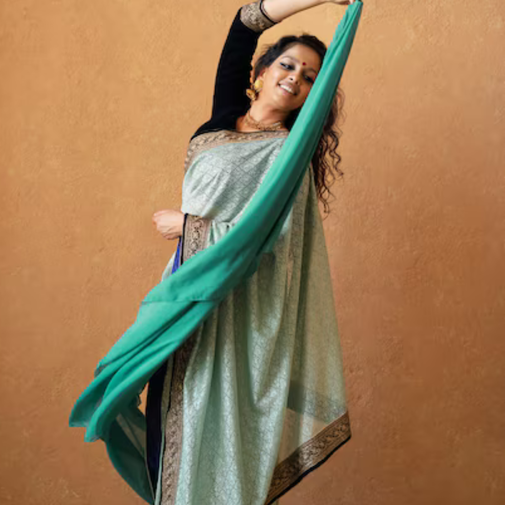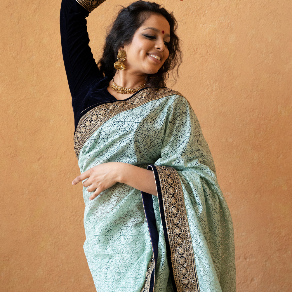 এই মনোমুগ্ধকর শাড়িটি ঐতিহ্য এবং আধুনিকতার এক চমৎকার মিশ্রণ। সবুজাভ-ধূসর রঙের জমিনে সূক্ষ্ম কারুকার্য ও সোনালী পাড়ের কাজ এটিকে দিয়েছে এক রাজকীয় আকর্ষণ। শাড়ির সাথে প্রাণবন্ত সবুজ রঙের আঁচলটি (বা দুপাট্টা) যুক্ত হয়ে এনেছে এক ঝলমলে বৈপরীত্য। কালো ভেলভেটের জমকালো ব্লাউজ এবং মানানসই গহনা এই সাজকে করে তুলেছে অনন্য ও উৎসবমুখী। যেকোনো বিশেষ অনুষ্ঠান বা ঘরোয়া আয়োজনে এই শাড়িটি আপনাকে দেবে এক স্মরণীয় ও ক্লাসিক চেহারা।